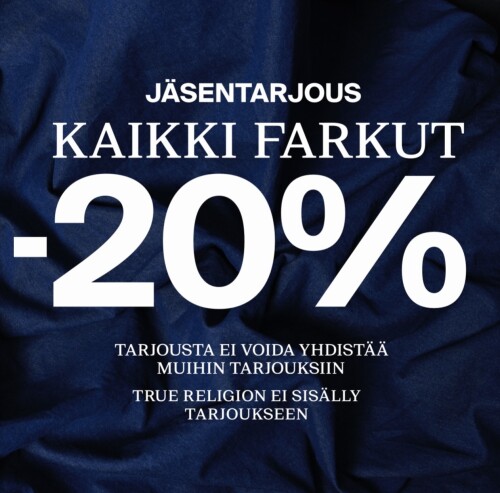Puuvillan, sekä Carlingsin 11v synttäreiden kunniaksi tarjoamme jäsenille kaikki norm.hintaiset Farkut -20% (ei koske true religionia)