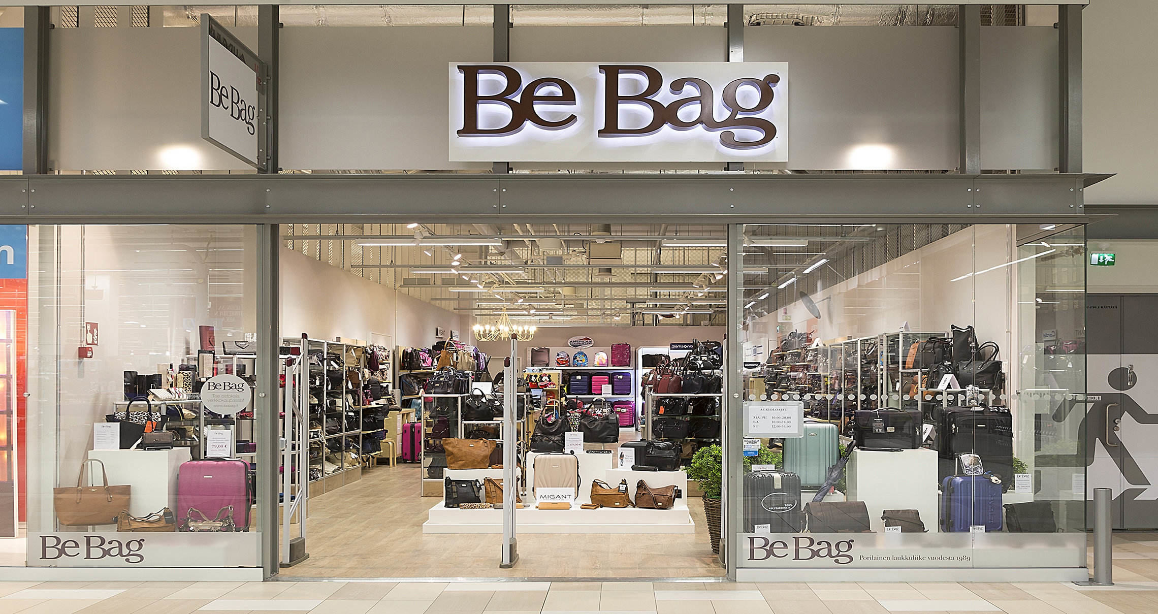 BeBag on porilainen käsilaukkujen ja matkalaukkujen erikoisliike. Myymälämme on ollut Porissa jo vuodesta 1989. Tuotevalikoimaamme kuuluvat käsi- ja olkalaukut, juhlalaukut, kassit, lompakot, nahkakäsineet, sateenvarjot, matkalaukut ja matkailutarvikkeet, salkut ja reput.