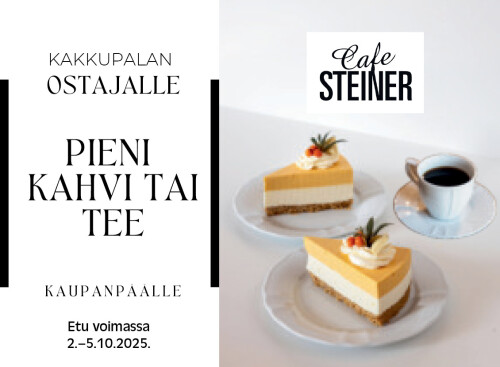 Tai nauti Cafe Steinerin rennosta ilmapiiristä tuoreen kahvin kera – parhaimmillaan hyvässä seurassa. Kahvin kaveriksi vitriinistämme löytyy esimerkiksi herkulllisia täytettyjä patonkeja, ilmavia croissantteja ja suussa sulavia kakkupaloja.