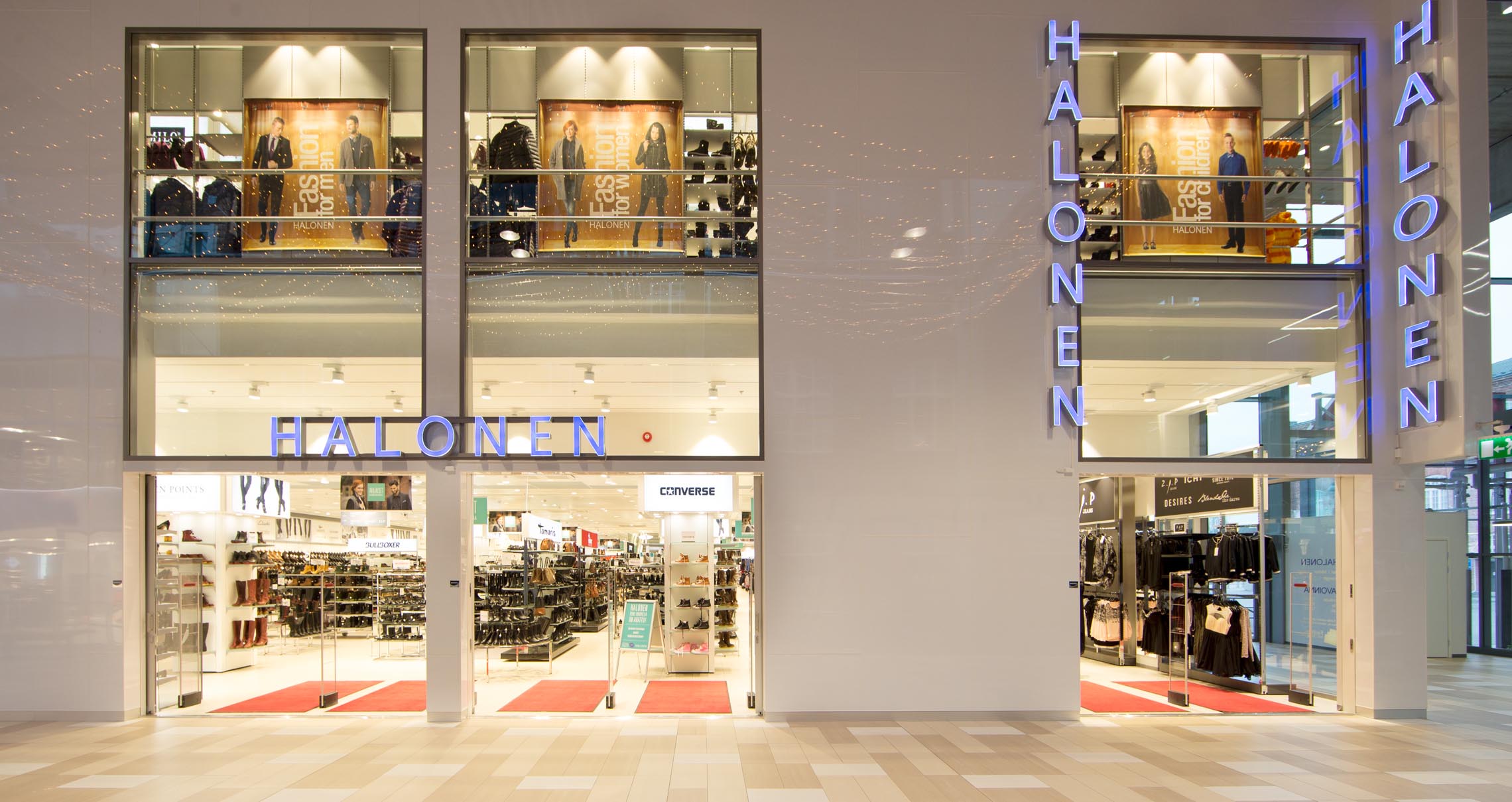 Puuvillan Halosella on naisten, miesten, lasten (juhla) sekä jalkineosastot, joilla kaikilla myydään tuotemerkkien