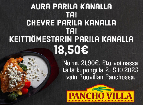 Pancho Villa on tex-mex tyylinen ruokaravintolaketju, jonka tiivistunnelmaiset ravintolat tunnetaan reilusti maustetusta ruoasta ja runsaista annoksista. Meillä käy Puuvillan kauppakeskuslahjakortti!