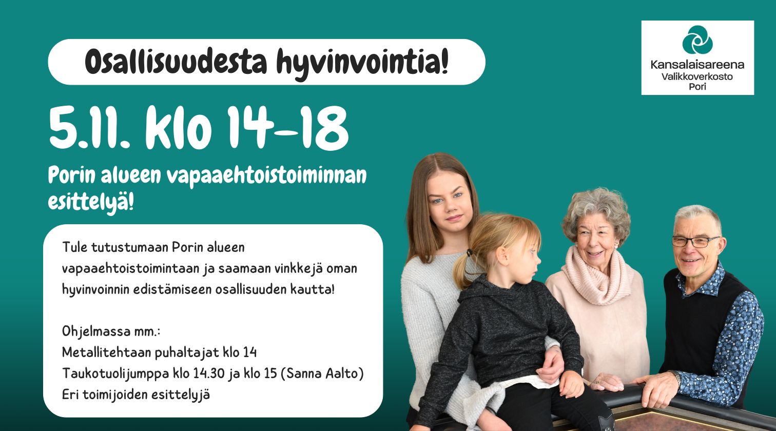 Osallisuudesta hyvinvointia -tapahtumassa tutustutaan Porin alueen vapaaehtoistoimintaan ja eri toimijoiden tarjoamaan toimintaan.