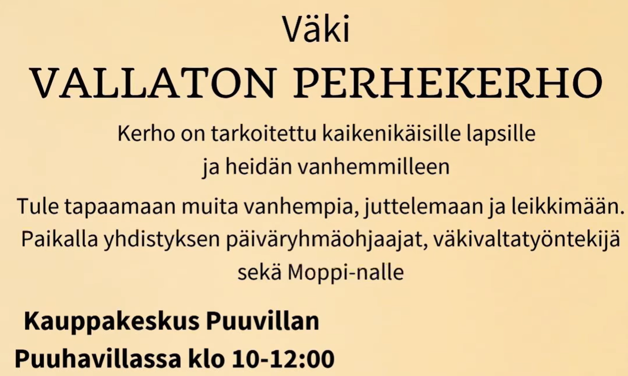 VäkiVallaton perhekerho kokoontuu taas Puuvillan Puuhavillassa. Tervetuloa kaiken ikäiset lapset vanhempineen!