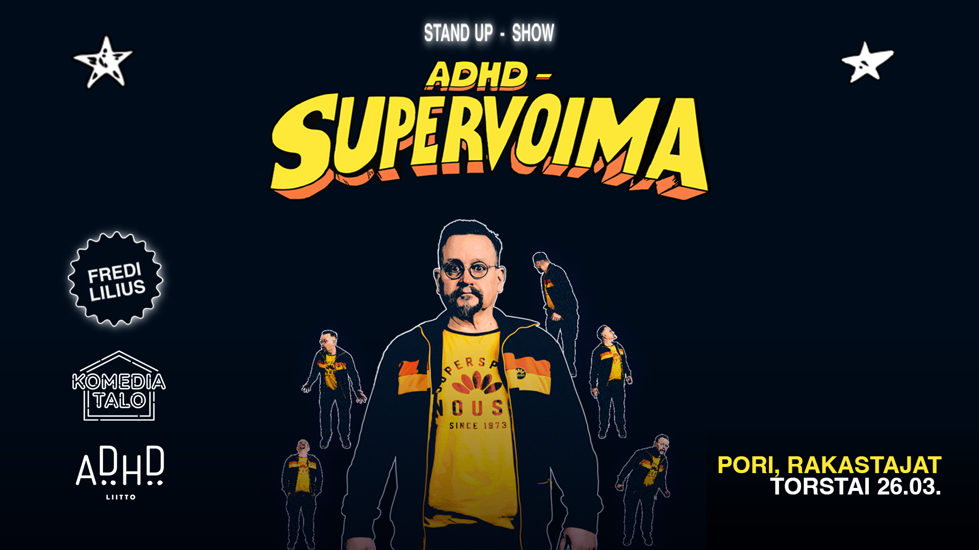 Koomikko Fredi Lilius on valjastanut ADHD:n supervoimakseen! Tule mukaan pitämään hauskaa, kun Fredi kertoo stand up -show'ssaan omasta pään sisäisestä neljän ruuhkastaan! To 26.3. klo 18 | Liput 30€ (ovelta 35€) | K18