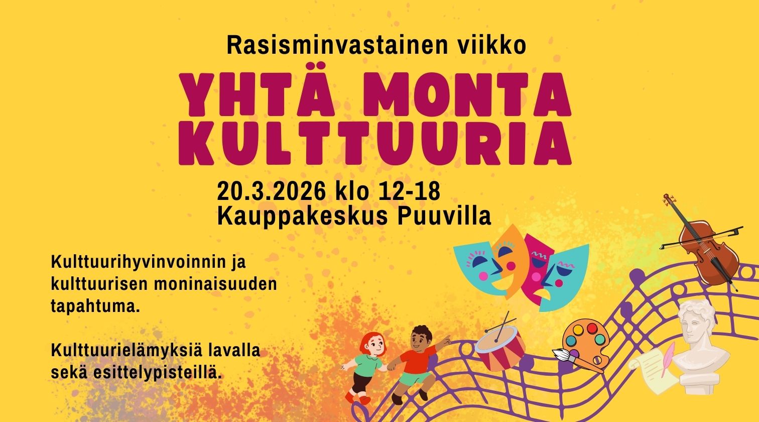 Kulttuurihyvinvoinnin ja kulttuurin moninaisuuden tapahtuma. Teemana Rasisminvastainen viikko.
