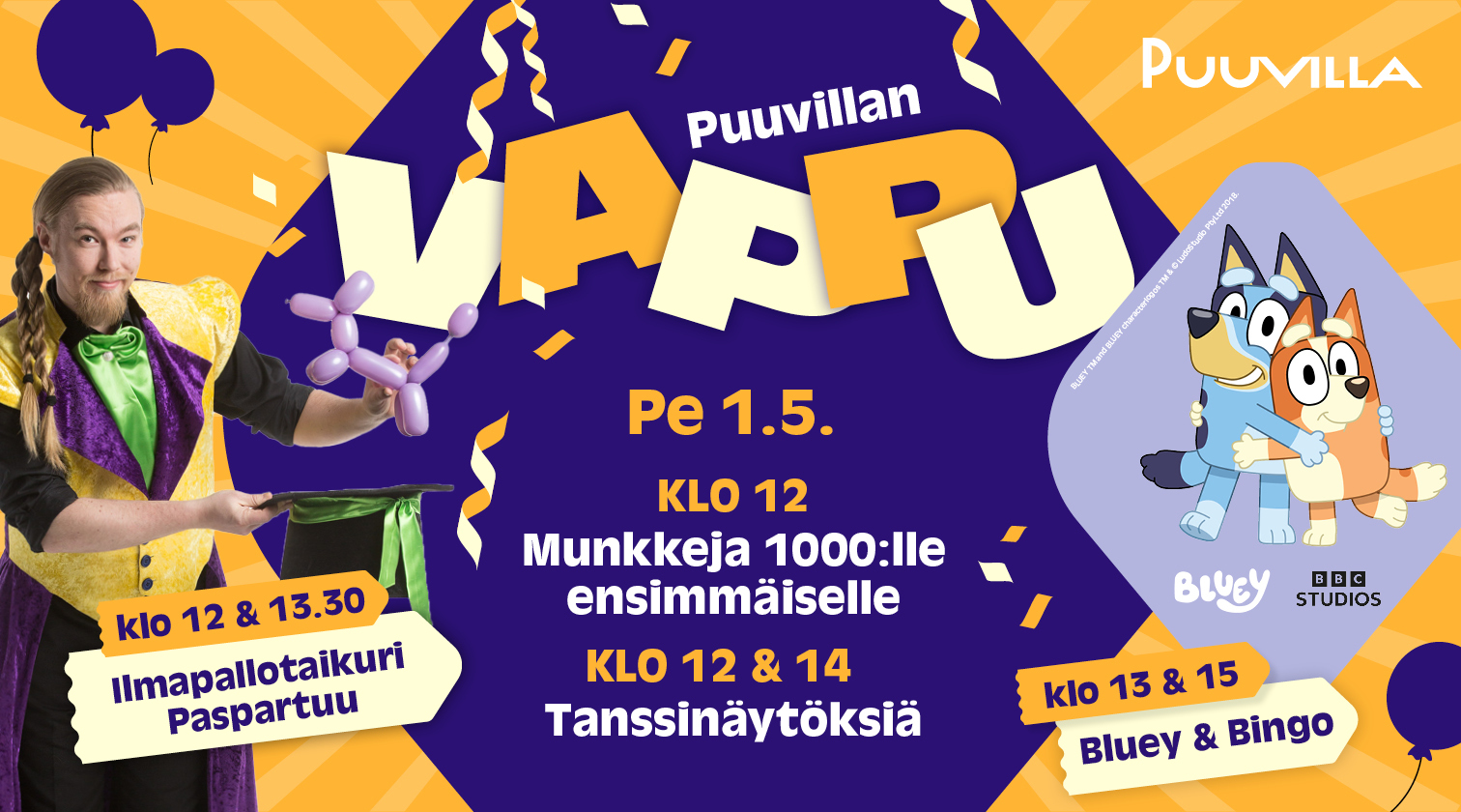 Simasuut sikkuralle ja tippaleivät käkkärälle! Puuvillan vappu on täynnä hauskaa ja hyväntuulista ohjelmaa. Menossa mukana ilmapallotaikuri Paspartuu ja lasten suosikkimaskotit Bluey & Bingo! Tule mukaan!