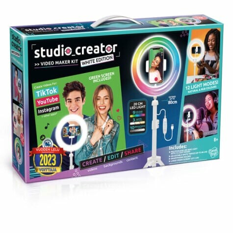Studio Creator Video Maker Kit on täydellinen kotistudiosetti, jonka avulla voit luoda erilaisia videoita! Sisältää säädettävän (max.80cm) jalustan puhelinpidikkeellä, monivärisen LED-rengasvalon, jossa on 12 väritilaa sekä vihreän taustakankaan. 19,95€ nh.39,-