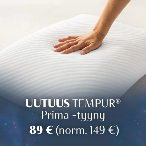 UUTUUS! TEMPUR Prima –tyyny 89 € (norm. 149 €) Perinteisen mallinen TEMPUR Prima –tyyny tarjoaa miellyttävän pehmeän tunteen ja painetta vähentävää tukea niskalle ja päälle. Riippumatta siitä, miten nukut: vatsalla, selällä tai kyljellä, TEMPUR Prima® -tyyny mukautuu tarkasti kehosi muotoihin.