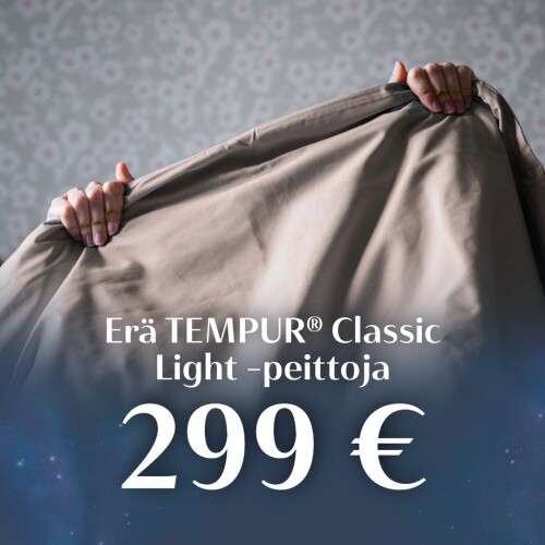 Erä Classic Down Light -peittoja 299 € (norm. 423 €). Säästä 124 € Rakastetut lämpöä säätelevät TEMPUR®-peitot tekevät unesta levollisempaa ja nukkumislämpötilasta optimaalisen läpi yön! Tämä peitto sopii sinulle, joka rakastat muhkean peiton ylellistä tunnetta ja haluat nauttia rauhallisista yöunista. Tarjous on voimassa 31.12.2025 asti tai niin kauan kuin 200 kpl erää riittää.