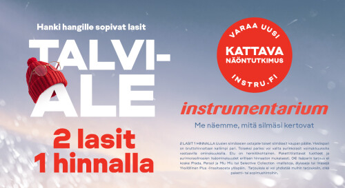Tarjous koskee yli 100 euron kehyksiä ostaessasi silmä- tai aurinkolasit voimakkuuksilla eikä sitä voi yhdistää muihin tarjouksiin, sopimus- tai pakettihintoihin. Varilux-, Eyezen- tai Stellest-linssit -30 %. Kehysvalikoima vaihtelee myymälöittäin.