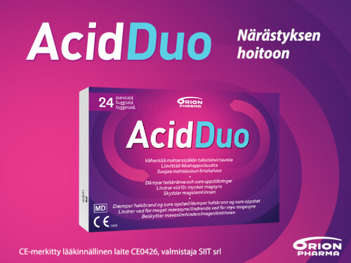 UUTUUS! Nopea apu närästykseen, hapon aiheuttamaan poltteluun ja näihin liittyvän raskaan olon lievittämiseen. Acidduo purutabletit lievittävät mahan liikahappoisuutta ehkäisten närästystä, vatsakipua ja happamuuteen liittyviä ruoansulatusvaivoja. Acidduo valmistetta voi myös käyttää gastriitin (mahalaukun limakalvon tulehduksen, ns. mahakatarrin) tukihoitona. Acidduo 24 purutabl. 8,63 € ja 36 purutabl. 10,79 €. CE-merkitty lääkinnällinen laite. Kysy lisää Puuvillan Apteekista!