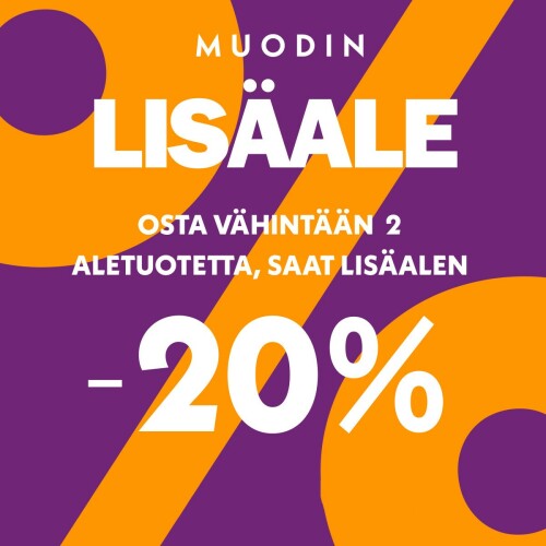Lisäale -20%! Ostaessasi vähintään kaksi aletuotetta, saat lisäalen -20%! Etu voimassa myymälöissä.