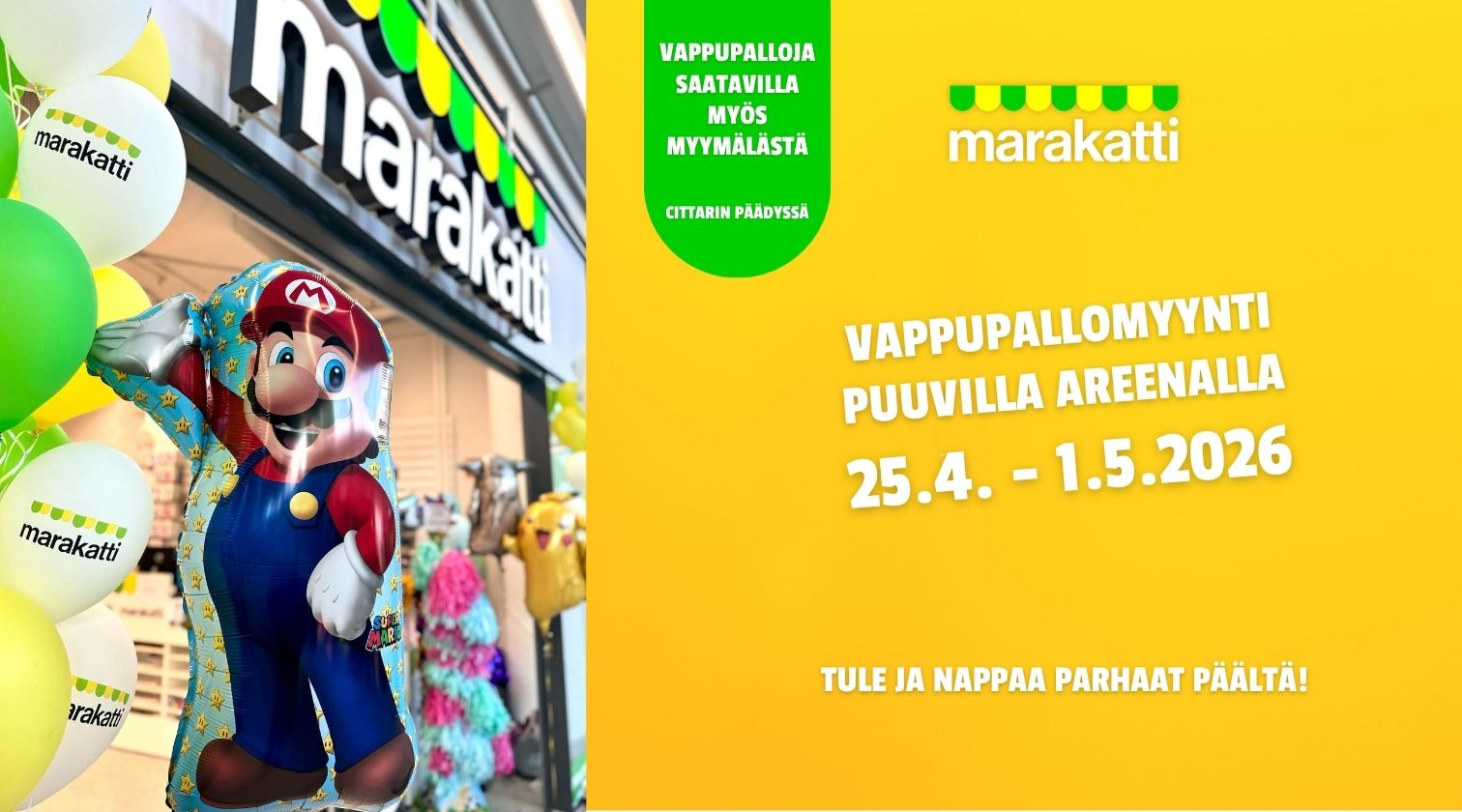Myynti Puuvilla aukiolla tai sen läheisyydessä 25.4.-1.5.2026! Vappupalloja saatavana myös myymälästä!