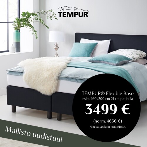 Mallisto vaihtuu! Nyt saatavilla erä TEMPUR Flexible Base -vuoteita 25 % alennuksella - tarjous on voimassa niin kauan kuin erää riittää! Esimerkiksi TEMPUR® Flexible Base –parivuode 160x200 cm alk. 3499 € (norm. 4666 €) Kotimainen TEMPUR Flexible Base -sänky edustaa pelkistettyä pohjoismaista muotoilua ja se on suunniteltu TEMPUR-malliston paksuille patjoille – Medium, Soft sekä Firm-patjoille. Ota asiantuntija avuksi sopivan TEMPUR®-patjan valintaan. Sängyn runko on valmistettu kestävästä massiivipuusta ja lujasta, vääntöjäykästä vanerista ja verhoiluna on musta huonekalukangas.