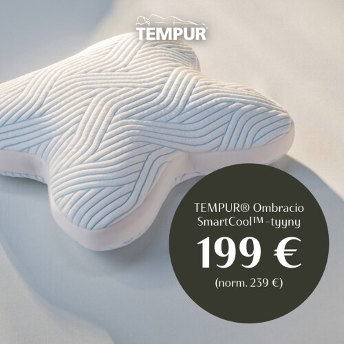 Loka-marraskuun TEMPUR-kampanjassa TEMPUR Ombracio SmartCool -tyyny nyt hintaan 199 € (norm. 239 €). Ombracio on best-seller ja syystä! Mikä tekee Ombraciosta erityisen suositun tyynyn? Muokattavuus - voit säätää kokoa itsellesi sopivaksi, Sopii moneen eri nukkuma-asentoon - erityisesti vatsallaan nukkuville, Ainutlaatuinen muotoilu, Ihana pehmeys ja täydellinen tuki, Piipahda myymälässä kokeilemassa sopivaa tyynyä!