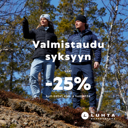 Saat –25 %, kun ostat vähintään 2 tuotetta! Päivitä vaatekaappisi talven viilenevien säiden varalle ja valitse omasi monipuolisesta ulkoilun- ja vapaa-ajan vaatevalikoimasta. Etu voimassa 1-.2.11.2025. Etu koskee normaalihintaisia tuotteitamme.