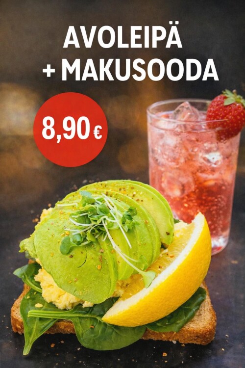 Voileipä samettisella munakokkelilla, pinaatilla, herkullisella talon kastikkeella, joiden päätäyte on joko kylmäsavu, kana-pekoni tai avocado. Lisäksi makusooda passionhedelmällä, mangolla tai vadelmalla.