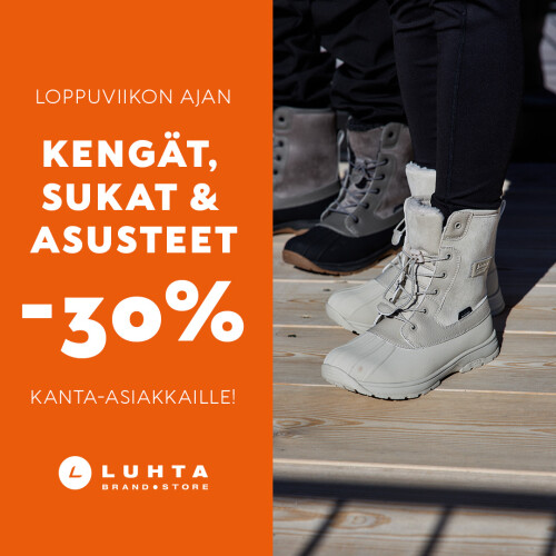 Kengät, sukat ja asusteet –30 % kanta-asiakkaille! Valitse omasi Luhta Brand Storen monipuolisesta valikoimasta. Etu koskee normaalihintaisia tuotteita ja on voimassa su 16.11. asti.