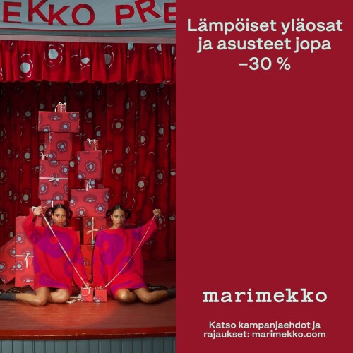 Esittelyssä talvikauden toivotuimmat neuleet, pipot ja huivit. Nyt lämpimät yläosat ja asusteet –30 % ja logokassi kaupan päälle, kun ostat yli 100 €:lla. Etu on voimassa asiakasohjelmamme jäsenille Marimekko-myymälöissä ja verkkokaupassa 16.11.2025 asti. Etu ei ole voimassa outlet-myymälöissä.