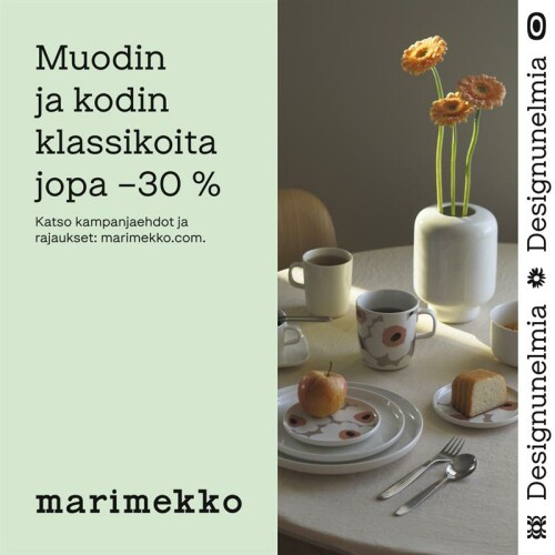Muodin ja kodin klassikoita –30 %, kun ostat yli 100 €:lla. Etu koskee valikoituja tuotteita Marimekko-myymälöissä ja verkkokaupassa ja on voimassa sunnuntaihin 26.10.2025 asti. Katso kampanjaehdot ja rajaukset: marimekko.com