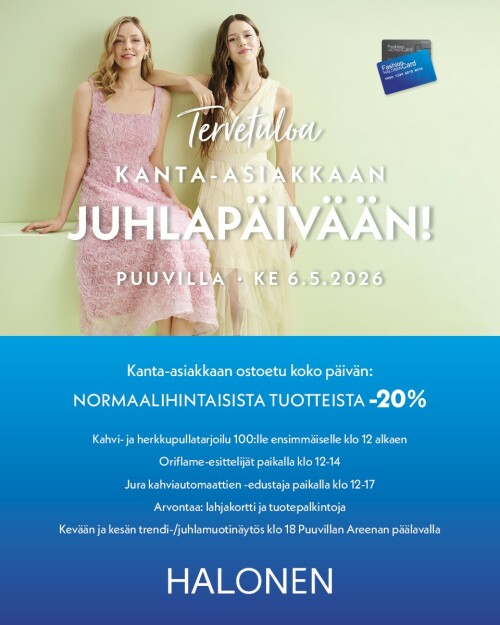 Halosen muotipäivä ke 6.5.! -Kahvitarjoilu 100:lle ensimmäiselle klo 12 alkaen -Oriflame-edustajat paikalla klo 12-14 -Jura kahvikone- esittelijä paikalla klo 12-17 -Muotinäytös Puuvillan Areenan lavalla klo 18! -Arvonta Päivän aikana kanta-asiakasorttitarjouksena kaikki normaalihintaiset tuotteet -20%